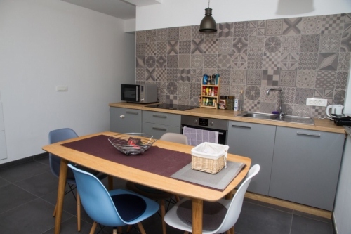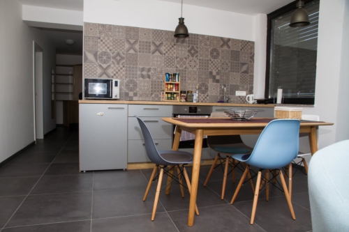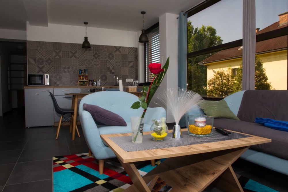 Stanovanje se nahaja v prvem nadstropju poslovno stanovanjske stavbe Pam na Mušičevi ulici 15 v Novem mestu, v skupni izmeri 59,20 m2, ki obsega opremljene stanovanjske prostore - dnevna soba s kuhinjo, spalnica, otroška soba, kopalnica, wc,  hodnik. Stanovanju pripada tudi souporaba skupnih prostorov in 1 parkirni prostor.